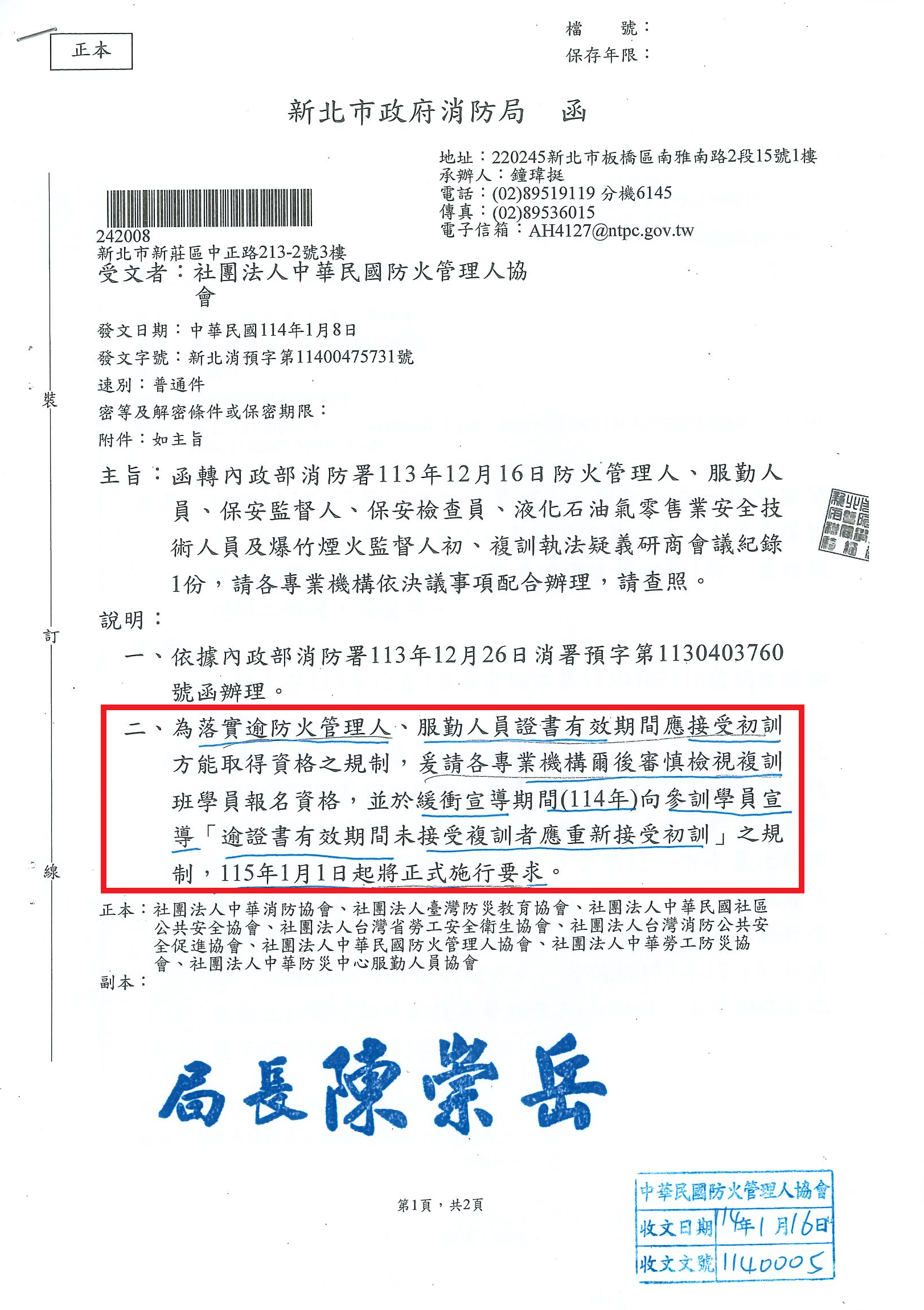 板橋複訓場次 115年01月23日 確定開課 (星期 五 ) 訓練地址:新北市板橋區雙十路一段25號 (江子翠捷運站4號出口直走步行約12分鐘,或搭乘231公車(約15分一班),到達永安公園活動中心站下) 如有被消防隊開單請來電告知會協助處理 |